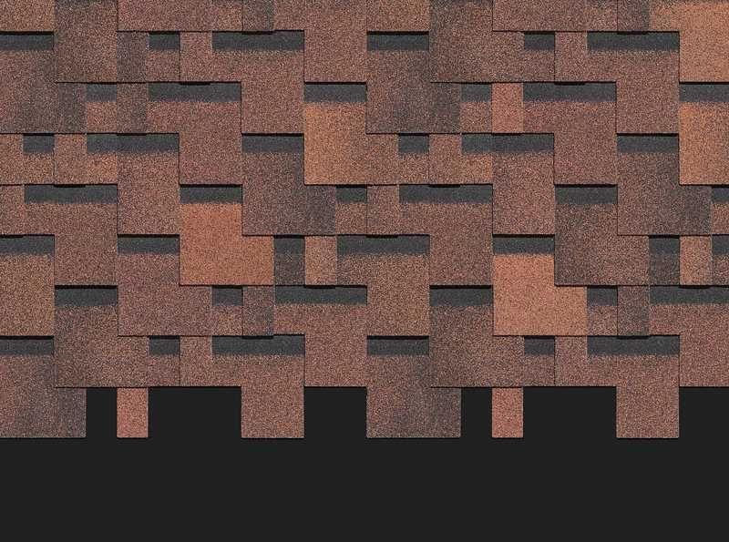 Черепица выполнена в приглушенных кофейных оттенках. Нестандартная форма лепестков гонтов эффектно подчеркнута реалистичным эффектом тени. Кровля гармонично смотрится с фасадами в светлых оттенках, под натуральный брус, камень и клинкерный кирпич.