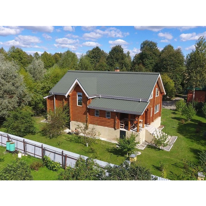 Натуральный темно-зеленый цвет черепицы хорошо смотрится на фоне любого природного ландшафта. Глубину оттенка дополняет строгая гексагональная форма лепестков и трехмерный эффект тени. Кровля гармонично дополнит фасады, выполненные под натуральный брус, в сливочных и фисташковых тонах.