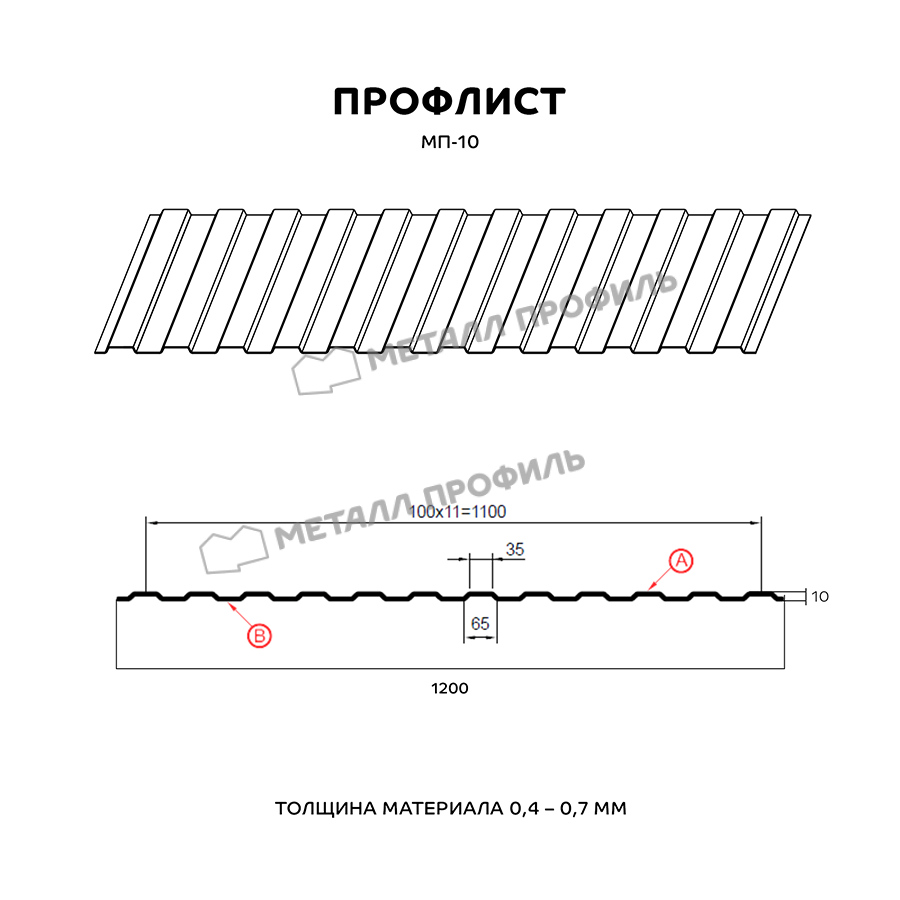 Профилированный лист МП-10x1100-B (PURETAN-20-RR23-0,5) — популярный материал в Усть луге для монтажа забора. Представляет собой стальной оцинкованный лист с покрытием. Общая толщина стальной основы с оцинковкой и защитно-декоративным покрытием — 0.5 мм.После проката на специальном оборудовании сталь приобретает рисунок из повторяющихся волн. Несущая способность профилированного листа на порядок выше плоского.